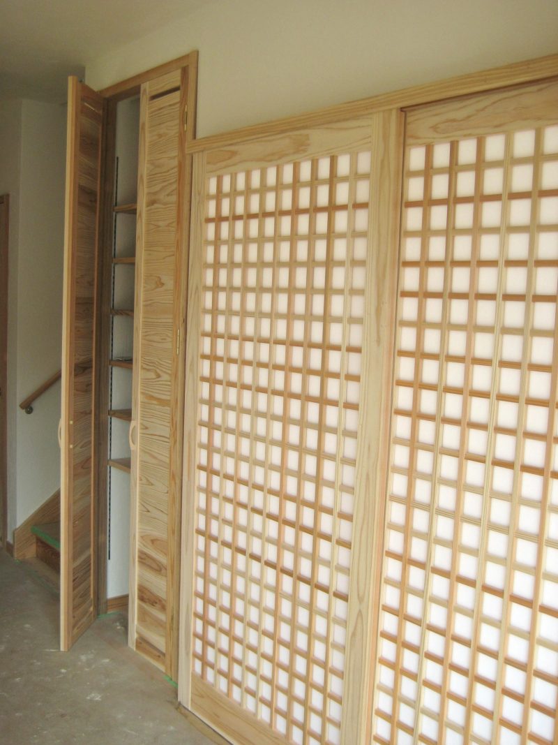 コメント 杉板の両開き収納板戸と杉板格子戸は引違いのアクリル入りの吊戸。