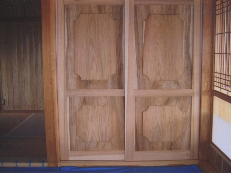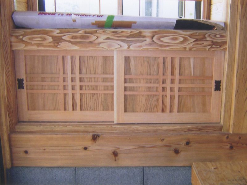 コメント 杉板でトイレ収納引違い扉や玄関入口の引違い戸、又和室に押入れ収納の大きな引違い板戸は木目を活かした重厚感のある扉。